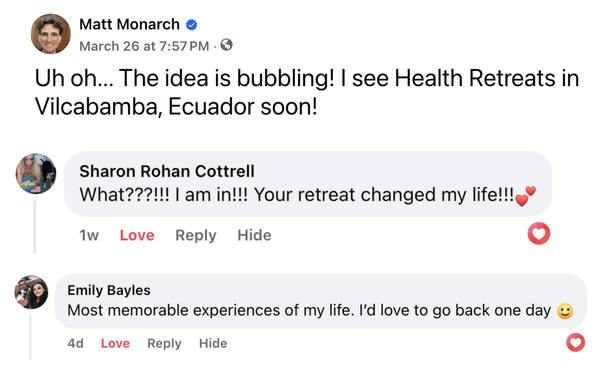 transformations from our retreats within Vilcabamba are so profound, here are what a couple of people had to say on my most recent Facebook post about our retreats.